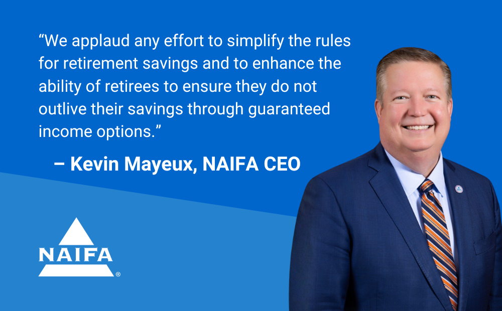 Rep. Panetta’s press release on the legislation quotes NAIFA CEO Kevin Mayeux, CAE, as saying: “NAIFA is pleased to endorse the Retirement Simplification and Clarity Act, introduced by Rep. Panetta (D-CA) and Rep. LaHood (R-IL). As the largest national association of insurance and financial advisers with members assisting hard-working, everyday Americans in all states and Congressional districts with retirement savings choices, we applaud any effort to simplify the rules for retirement savings and to enhance the ability of retirees to ensure they do not outlive their savings through guaranteed income options. This bill will advance those worthy goals, and NAIFA looks forward to working with the sponsors to see it enacted.”